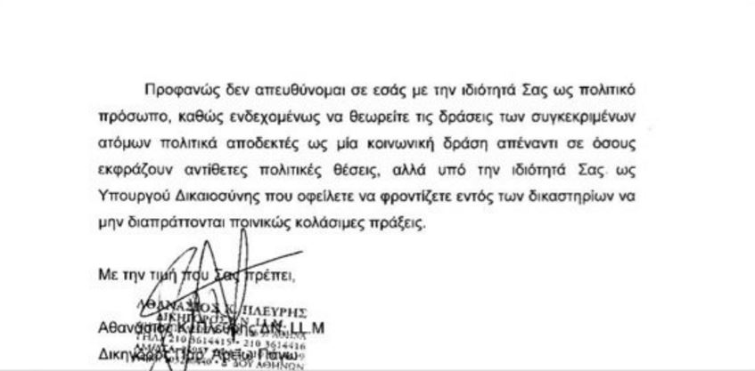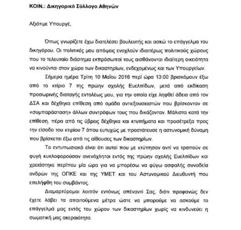 “Διαμαρτύρομαι εντόνως απέναντί σας διότι προσφανώς δεν έχετε λάβει τα απαιτούμενα μέτρα ώστε να μπορούμε να ασκούμε το επάγγελμά μας εντός του χώρου των δικαστηρίων χωρίς να κινδυνεύει η σωματική μας ακεραιότητα” αναφέρει μεταξύ άλλων ο δικηγόρος και πρώην βουλευτής.
