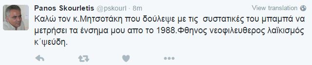 Η απάντηση του κ. Σκουρλέτη ήρθε μέσω Twitter: “Καλώ τον κ.Μητσοτάκη που δούλεψε με τις συστατικές του μπαμπά να μετρήσει τα ένσημα μου απο το 1988.Φθηνος νεοφιλευθερος λαϊκισμός και ψεύδη”.