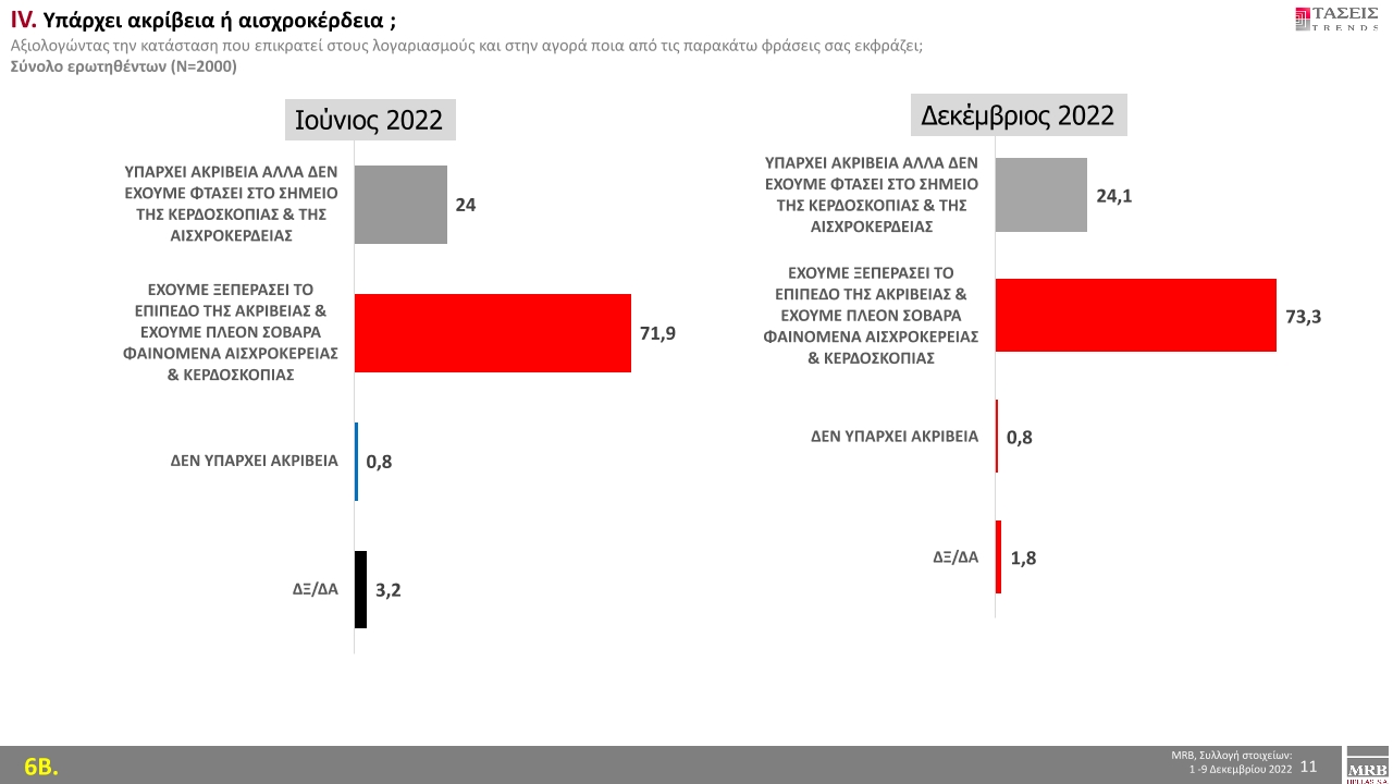 Το 73,3 % απαντά ότι έχουμε ξεπεράσει το επίπεδο της ακρίβειας και έχουμε πλέον σοβαρά φαινόμενα αισχροκέρδειας και κερδοσκοπίας.