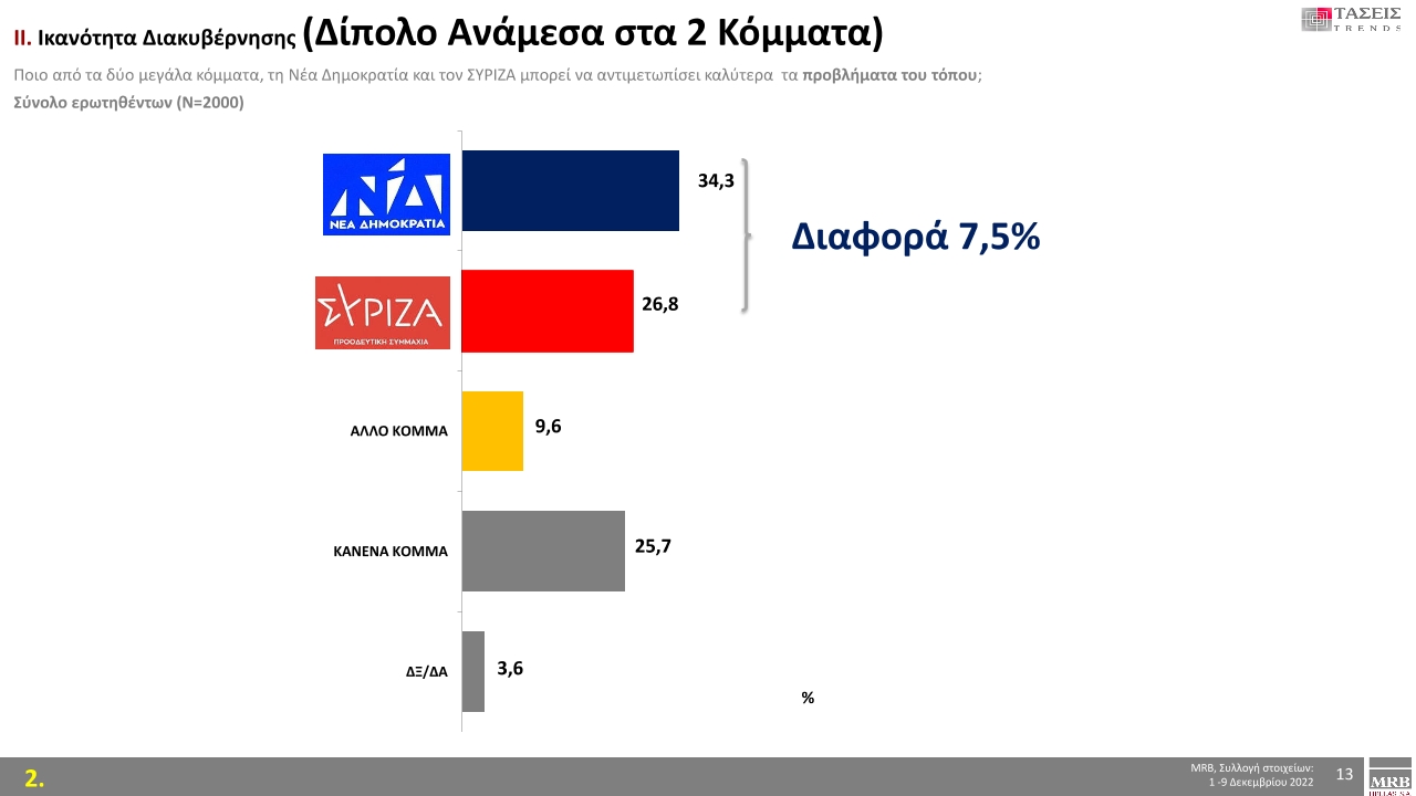 Στο ερώτημα ποιο από τα δύο κόμματα, ΝΔ ή ΣΥΡΙΖΑ, θα θέλατε να κερδίσει έστω και με μία ψήφο διαφορά στις επερχόμενες βουλευτικές εκλογές, το 33,5 % απαντά η ΝΔ, το 30,6 % ο ΣΥΡΙΖΑ, ενώ το 25,7 % κανένα κόμμα.