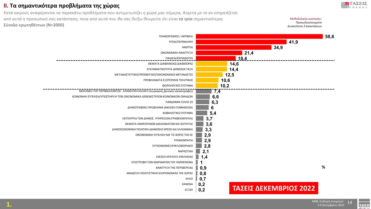 Οι πολίτες θεωρούν ότι τα 3 σημαντικότερα προβλήματα της χώρας είναι: Πληθωρισμός/Ακρίβεια με 58,6 %, Υγεία/Περίθαλψη με 41,9 %, Ανεργία με 34,9 %.