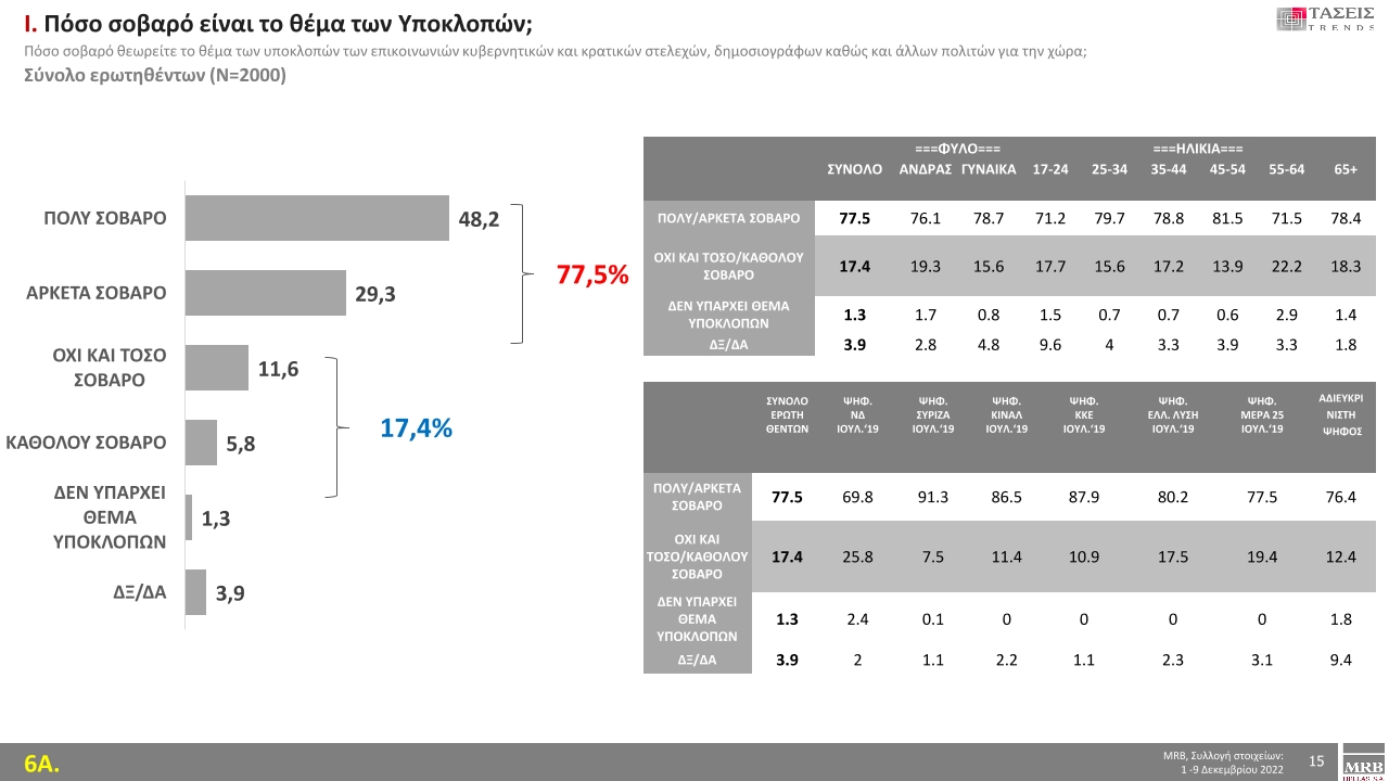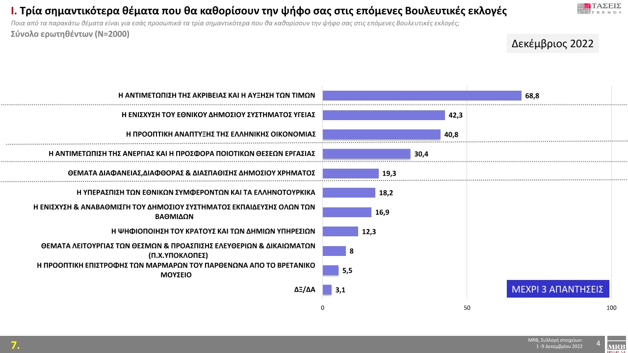 Στην κάρτα «τα τρία σημαντικότερα θέματα που θα καθορίσουν την ψήφο σας στις επόμενες βουλευτικές εκλογές» το 68,8 % απαντά «η αντιμετώπιση της ακρίβειας και η αύξηση των τιμών», το 42,3 % «η ενίσχυση του εθνικού δημόσιου συστήματος υγείας» και το 40,8 «η προοπτική ανάπτυξης της ελληνικής οικονομίας».