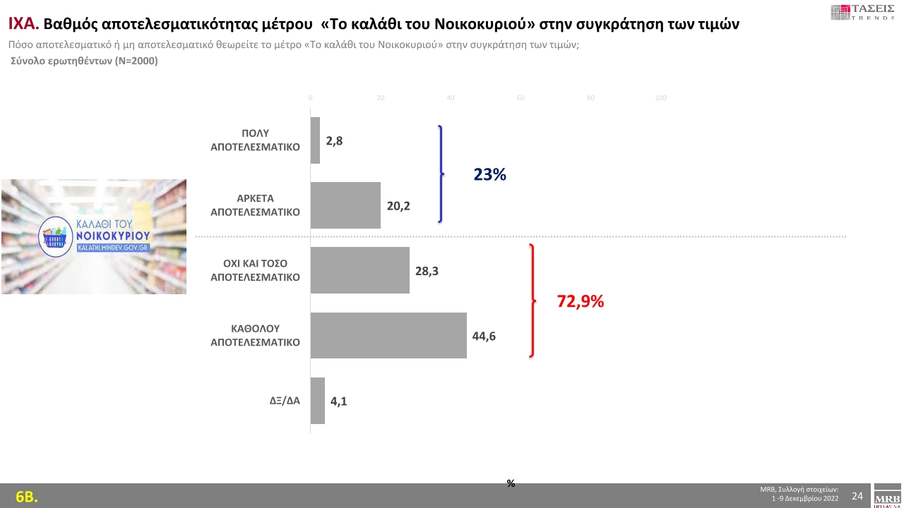 Για τον βαθμό αποτελεσματικότητας του μέτρου «το καλάθι του νοικοκυριού» στη συγκράτηση των τιμών το 72,9 % απαντά «όχι και τόσο αποτελεσματικό/καθόλου αποτελεσματικό».
