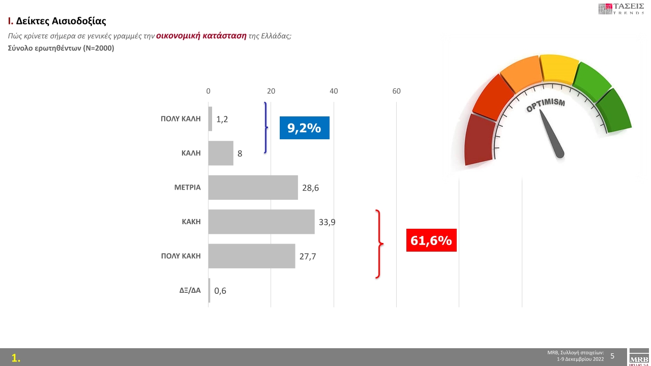 Στο ερώτημα, «πώς κρίνετε σε γενικές γραμμές σήμερα την οικονομική κατάσταση της Ελλάδας», το 61,6 % απαντά «Πολύ κακή – κακή» και το 9,2 % απαντά «Πολύ καλή-καλή».