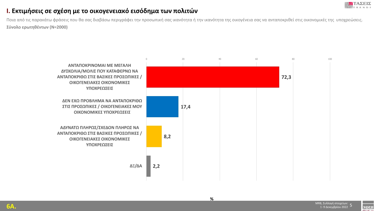 Στην κάρτα που αφορά τις εκτιμήσεις σε σχέση με το οικογενειακό εισόδημα των πολιτών το 72,3 % απαντά «ανταποκρίνομαι με μεγάλη δυσκολία/μόλις που καταφέρνω να ανταποκριθώ στις βασικές προσωπικές/οικογενειακές οικονομικές υποχρεώσεις».