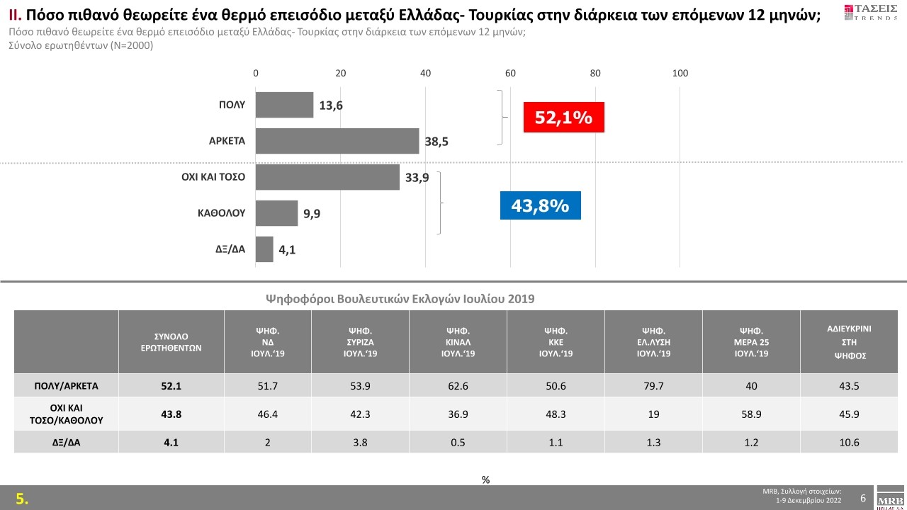 Στο ερώτημα «Πόσο πιθανό θεωρείτε ένα θερμό επεισόδιο μεταξύ Ελλάδας-Τουρκίας στη διάρκεια των επόμενων 12 μηνών», οι πολίτες με ποσοστό 52,1 % απαντούν «πολύ» και «αρκετά».