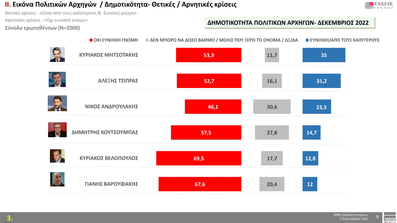 Στον πίνακα που ακολουθεί δείτε πώς διαμορφώνεται στις τάσεις Δεκεμβρίου 2022 της MRB η δημοτικότητα των πολιτικών αρχηγών.