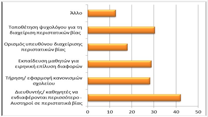 Ακολούθως, οι μαθητές ρωτήθηκαν για τις ενέργειες που απαιτούνται για τη δημιουργία ασφάλειας στον σχολικό χώρο. Στο μεγαλύτερο ποσοστό οι μαθητές (αναφέρουν) ανέφεραν ότι ο διευθυντής και οι εκπαιδευτικοί θα πρέπει να ενδιαφέρονται περισσότερο για τους μαθητές και να είναι περισσότερο αυστηροί σε περιστατικά βίας (13.923 μαθητές, μαθητές, ή ποσοστό 42.05%). Επίσης, είναι σημαντική η παρουσία ψυχολόγου στο σχολείο, ο οποίος θα διαχειρίζεται τα περιστατικά βίας (10.058 μαθητές, μαθητές, ή ποσοστό 30.38%), η τήρηση και η εφαρμογή των κανόνων του σχολείου (9.618 μαθητές, μαθητές, ή ποσοστό 28.14%), η καλλιέργεια ειρηνικής συνύπαρξης (9.523 μαθητές, μαθητές, ή ποσοστό 28.76%), και ο ορισμός ενός υπεύθυνου διαχείρισης των περιστατικών βίας στη σχολική μονάδα (5.935 μαθητές, μαθητές, ή ποσοστό 17.92%) για την αντιμετώπιση των φαινομένων (Γράφημα 5.14.).