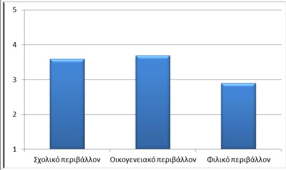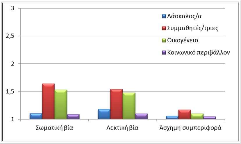 Τα αποτελέσματα έδειξαν την εμφάνιση ιδιαίτερα χαμηλών τιμών στη συχνότητα εμφάνισής τους στο σχολικό περιβάλλον τόσο από πλευράς δασκάλου όσο και από πλευράς μαθητών. Επίσης, χαμηλές τιμές παρουσιάζονται στο οικογενειακό και κοινωνικό περιβάλλον (Γράφημα 2.1.4.).
