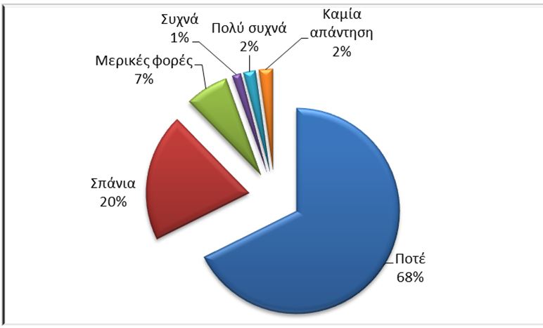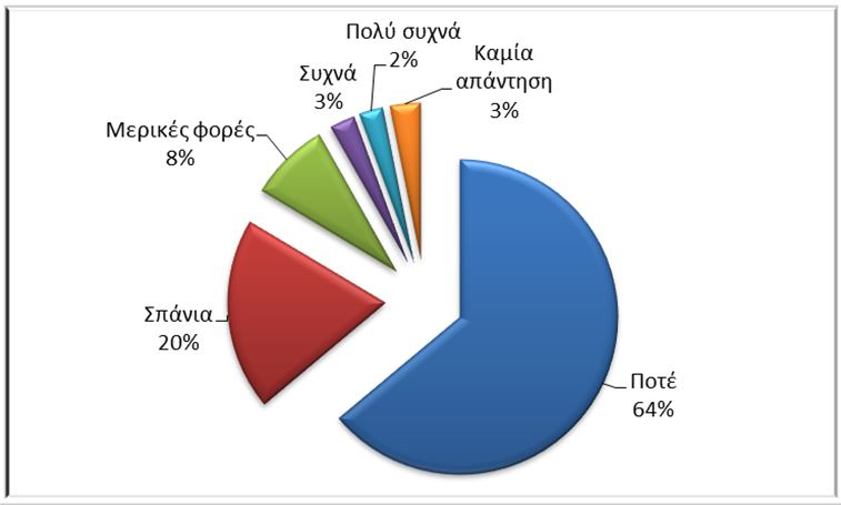 Σχετικά με το ποσοστό των μαθητών που έχουν βρεθεί στον ρόλο του θύματος, 63.90% των μαθητών απάντησαν «Ποτέ», 19.68% «Σπάνια», 8.23% «Μερικές φορές», ενώ 2.62% και 2.45% των μαθητών απάντησαν «Συχνά» και «Πολύ συχνά», αντίστοιχα (Γράφημα 5.5.). Σχετικά με το ποσοστό των μαθητών που έχουν βρεθεί στο ρόλο του θύτη, 67.62% των μαθητών απάντησαν «Ποτέ», 20.07% «Σπάνια», 6.81% «Μερικές φορές», ενώ 1.44% και 1.89% των μαθητών απάντησαν «Συχνά» και «Πολύ συχνά», αντίστοιχα (Γράφημα 5.6.).