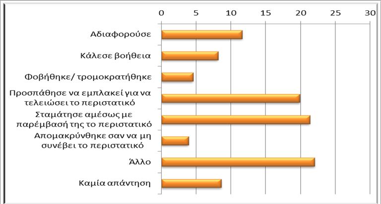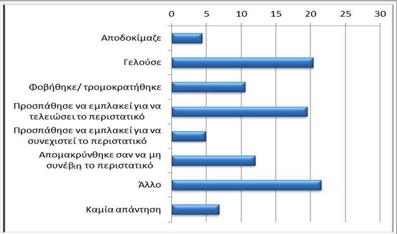 Οι αντιδράσεις των μαθητών στο περιστατικό του σχολικού εκφοβισμού ποικίλουν. Στο μεγαλύτερο ποσοστό, οι μαθητές γελούσαν (6.741 μαθητές, ή ποσοστό 20.36%), άλλοι προσπάθησαν να εμπλακούν για να τελειώσει πιο γρήγορα το περιστατικό (6.458 μαθητές, ή ποσοστό 19.50%) αρκετοί απομακρύνονταν σαν να μην συνέβη ποτέ (3.977 μαθητές, ή ποσοστό 12.01%) ενώ λιγότεροι αναφέρουν ότι φοβήθηκαν (3.489 μαθητές, ή ποσοστό 10.54%). Σε μικρότερο ποσοστό, οι μαθητές προσπάθησαν να εμπλακούν για να συνεχιστεί το περιστατικό (1609 μαθητές, ποσοστό 4.86%) και επιδοκίμασαν τη βίαιη συμπεριφορά (1.449 μαθητές, ή ποσοστό 4.38%) (Γράφημα 5.9.).