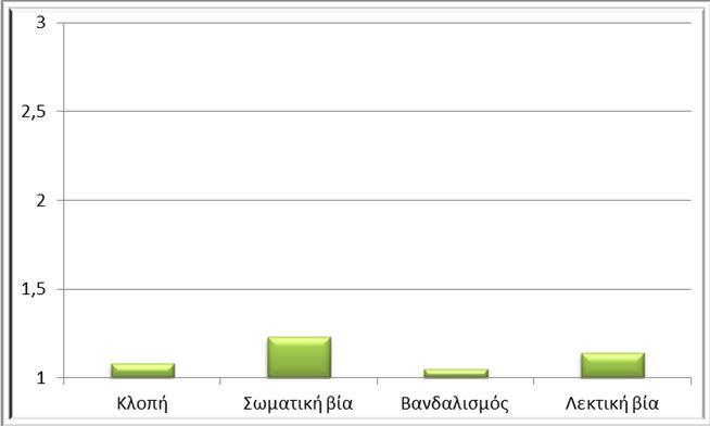 Γράφημα 2.1.4. Ιστόγραμμα μέσων τιμών των απαντήσεων των μαθητών Πρωτοβάθμιας Εκπαίδευσης ως προς τις μορφές θυματοποίησης στο σχολικό, οικογενειακό και κοινωνικό περιβάλλον
