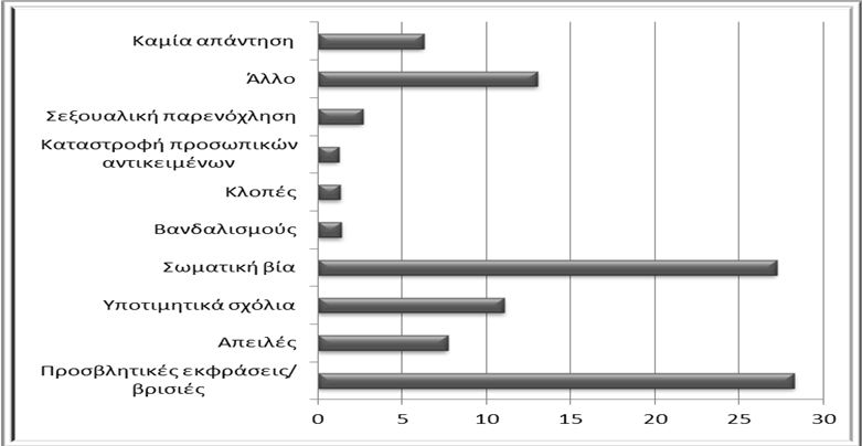 Η πιο συχνή μορφή εκφοβισμού είναι ο λεκτικός εκφοβισμός (ποσοστό 56.5%) που περιλαμβάνει την εξύβριση και την κοροϊδία, η αμέσως επόμενη μορφή είναι ο σωματικός εκφοβισμός (ποσοστό 30.5%) που περιλαμβάνει χτυπήματα – σπρωξίματα, και τέλος, ο κοινωνικός εκφοβισμός, η απομόνωση και η κοροϊδία των μαθητών από όλη την τάξη (ποσοστό 27.8%). Σε μικρότερα ποσοστά, οι μαθητές αναφέρουν ότι διακατέχονται από φόβο που τους δημιουργούν οι υπόλοιποι μαθητές (ποσοστό 15.4%) και, επίσης, ότι κάποιοι μαθητές τούς αποσπούν με τη βία προσωπικά αντικείμενα (ποσοστό 11.3%) (Γράφημα 2.1.3.).