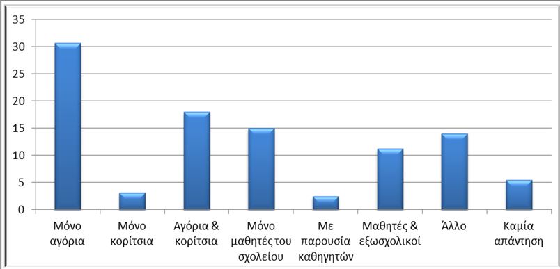 Σχετικά με τους εμπλεκόμενους στο περιστατικό σχολικής βίας και εκφοβισμού, στο μεγαλύτερο ποσοστό συμμετέχουν μόνο αγόρια (10.145 μαθητές, ή ποσοστό 30.64%), ακολούθως αγόρια και κορίτσια (5.950 μαθητές, ή ποσοστό 17.97%) και σε πολύ μικρότερο ποσοστό, μόνο κορίτσια (1.053 μαθήτριες, ή ποσοστό 3.18%). Στα περιστατικά αυτά, υψηλότερο είναι το ποσοστό συμμετοχής μόνο μαθητών του σχολείου (4.971 μαθητές, ή ποσοστό 15.01%) και λιγότερο των εξωσχολικών (3.739 μαθητές, ή ποσοστό 11.29%), ενώ τέλος, μικρό ποσοστό τέτοιων περιστατικών καταγράφεται με την παρουσία καθηγητών (814 μαθητές, ή ποσοστό 2.46%) (Γράφημα 5.8.).