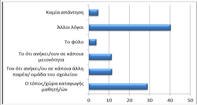 Στην πρώτη ερώτηση, οι μαθητές απάντησαν ότι το περιστατικό βίας συνδεόταν περισσότερο με τον τόπο / τη χώρα καταγωγής των μαθητών – θυμάτων (9.563 μαθητές, ή ποσοστό 28.88%), και έπειτα με τα χαρακτηριστικά της ομάδας/παρέας τους στο σχολείο (3.766 μαθητές, ή ποσοστό 11.37%). Επίσης, σημαντικό ποσοστό των μαθητών (3.709 μαθητές, ή ποσοστό 11.20%) δήλωσαν ότι περιστατικά βίας εκδηλώνονται σε μαθητές που ανήκουν σε μειονότητες, ενώ μικρό ποσοστό (1.212 μαθητές, ή ποσοστό 3.66%,) λόγω διαφορετικού φύλου. Τέλος, 40.27% των μαθητών αποδίδει τα περιστατικά βίας σε άλλους λόγους (Γράφημα 5.7.).