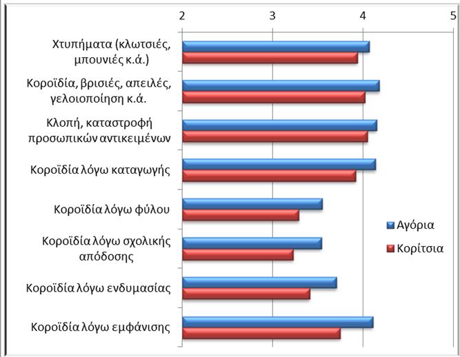 Στη συνέχεια εξετάσθηκαν οι διαφορές των απόψεων των δύο φύλων για τη χειρότερη μορφή εκφοβισμού – βίας. Οι μαθητές εμφανίσθηκαν έναντι των μαθητριών να αξιολογούν σε μεγαλύτερο βαθμό ως πιο αρνητικές όλες τις μορφές εκφοβισμού – βίας. Οι σημαντικότερες διαφορές εντοπίζονται στην κοροϊδία λόγω φύλου, σχολικής απόδοσης, ενδυμασίας και εμφάνισης, όπως επίσης και λόγω καταγωγής (Γράφημα 2.2.6.).