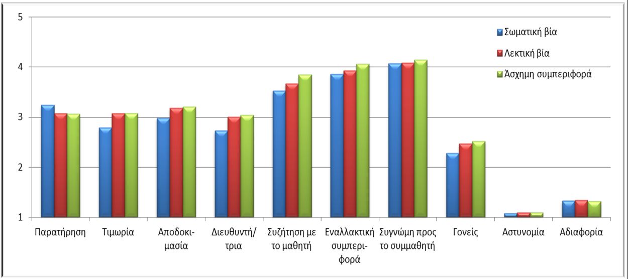 Στο Γράφημα 2.1.8. παρουσιάζονται συγκεντρωτικά οι μέσες τιμές των απαντήσεων των μαθητών της Πρωτοβάθμιας Εκπαίδευσης σχετικά με τους τρόπους παρέμβασης των εκπαιδευτικών στις περιπτώσεις σωματικής βίας, λεκτικής βίας και άσχημης συμπεριφοράς στο σχολικό περιβάλλον.