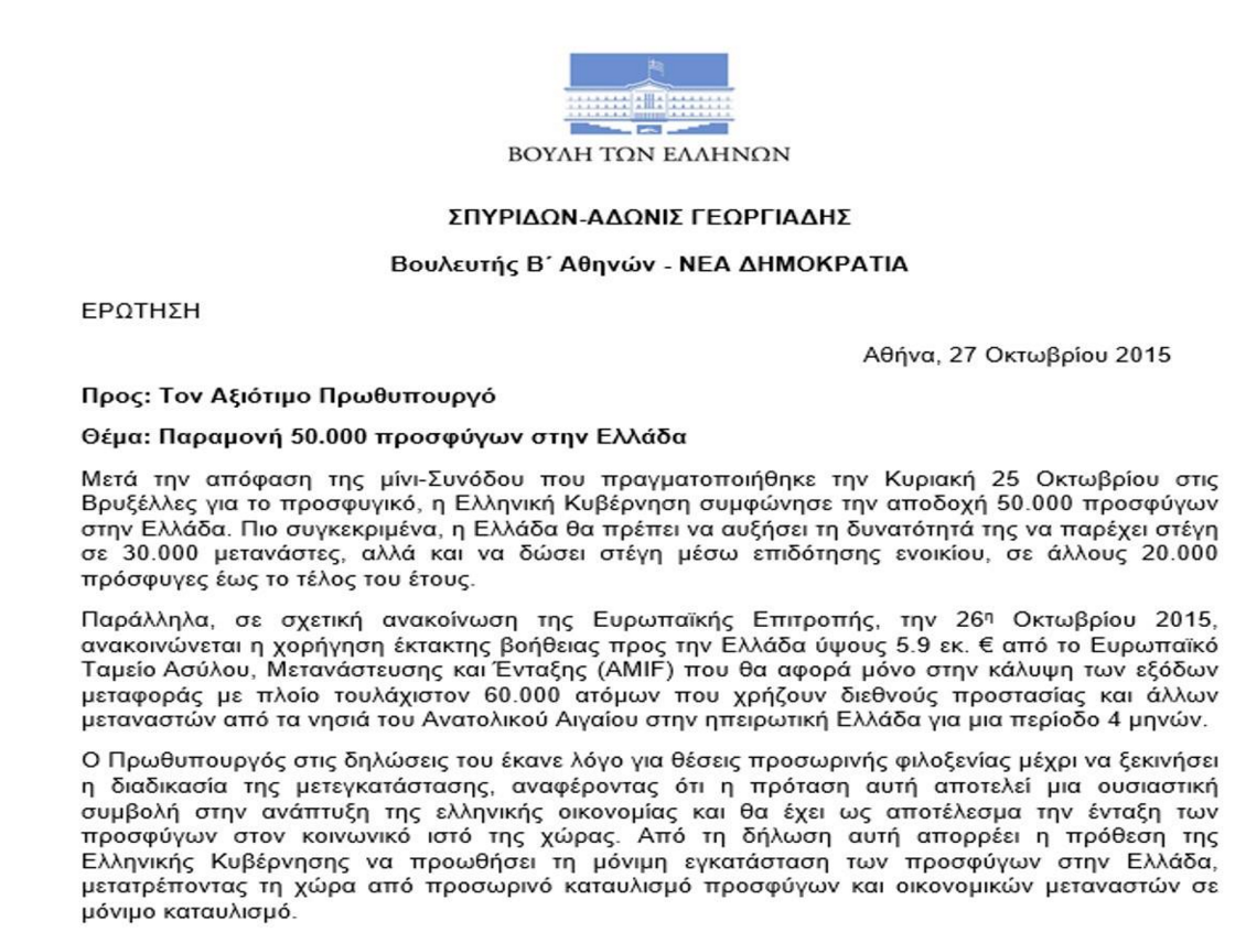 Ερώτηση προς τον Πρωθυπουργό για το ζήτημα της αποδοχής 50.000 προσφύγων στην Ελλάδα μετά την απόφαση της μίνι-Συνόδου για το προσφυγικό κατέθεσε ο βουλευτής και Υποψήφιος Πρόεδρος για την ηγεσία της Νέας Δημοκρατίας, Άδωνις Γεωργιάδης.