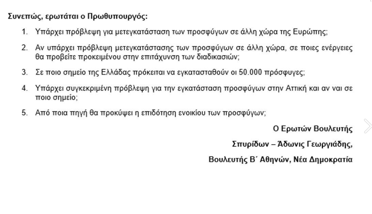 Στην ερώτησή του ο κ. Γεωργιάδης ρωτά τον Αλέξη Τσίπρα σε ποιο σημείο της Ελλάδας πρόκειται να εγκατασταθούν οι 50.000 πρόσφυγες, αν υπάρχει πρόβλεψη για μετεγκατάσταση των προσφύγων σε άλλη χώρα της Ευρώπης και από ποια πηγή θα προκύψει η επιδότηση ενοικίου των προσφύγων.
