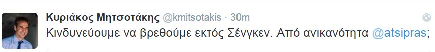 «Κινδυνεύουμε να βρεθούμε εκτός Σένγκεν. Από ανικανότητα @atsipras;» έγραψε στον προσωπικό του λογαριασμό στο twitter ο κ. Μητσοτάκης.
