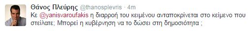 Ο πρώην βουλευτής της ΝΔ Θάνος Πλεύρης απευθυνόμενος στον υπουργό Οικονομικών Γιάνη Βαρουφάκη έγραψε στο twitter: “Κύριε Βαρουφάκη η διαρροή του κειμένου ανταποκρίνεται στο κείμενο που στείλατε; Μπορεί η κυβέρνηση να το δώσει στη δημοσιότητα;”