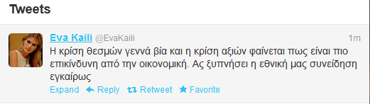 “Η κρίση θεσμών γεννά βία και η κρίση αξιών φαίνεται πως είναι πιο επικίνδυνη από την οικονομική” γράφει η Εύα Καϊλή στο twitter, σχολιάζοντας την επίθεση του εκπροσώπου της Χρυσής Αυγής, Ηλία Κασιδιάρη, εναντίον της Λιάνας Κανέλλης και της Ρένας Δούρου στην πρωινή εκπομπή του Γιώργου Παπαδάκη.”Ας ξυπνήσει η εθνική μας συνείδηση εγκαίρως” αναφέρει στο tweet η κ.Καϊλή Δείτε το tweet: