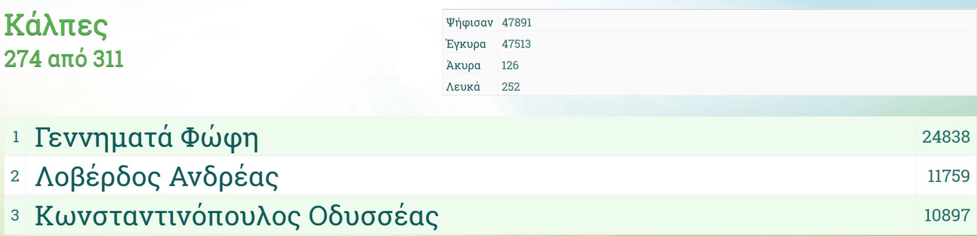 Μάχη για τη δεύτερη θέση δίνουν ο Ανδρέας Λοβέρδος και ο Οδυσσέας Κωνσταντινόπουλος, με 11.759 και 10.897 ψήφους αντίστοιχα.