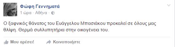 Τη θλίψη της για τον θάνατο του Ευάγγελου Μπασιάκου εξέφρασε μέσω του προσωπικού της λογαριασμού στο Facebook, η πρόεδρος του ΠΑΣΟΚ και επικεφαλής της Δημοκρατικής Συμπαράταξης, Φώφη Γεννηματά, γράφοντας:«Ο ξαφνικός θάνατος του Ευάγγελου Μπασιάκου προκαλεί σε όλους μας θλίψη. Θερμά συλλυπητήρια στην οικογένεια του».