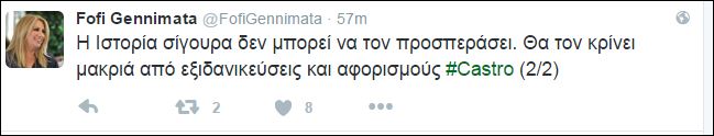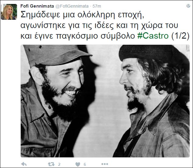 «Σημάδεψε μια ολόκληρη εποχή, αγωνίστηκε για τις ιδέες και τη χώρα του και έγινε παγκόσμιο σύμβολο», αναφέρει σε ανάρτησή της στο twitter η πρόεδρος του ΠΑΣΟΚ, Φώφη Γεννηματά, για τον Φιντέλ Κάστρο, και προσθέτει: «η Iστορία σίγουρα δεν μπορεί να τον προσπεράσει. Θα τον κρίνει μακριά από εξιδανικεύσεις και αφορισμούς».
