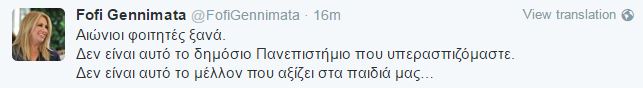Με ανάρτηση στον λογαριασμό της στο twitter η πρόεδρος του ΠΑΣΟΚ Φώφη Γεννηματα σχολιάζει το θέμα της επαναφοράς των «αιώνιων φοιτητών» στα πανεπιστήμια και τη σχετική τροπολογία που κατέθεσε το υπουργείο Παιδείας.