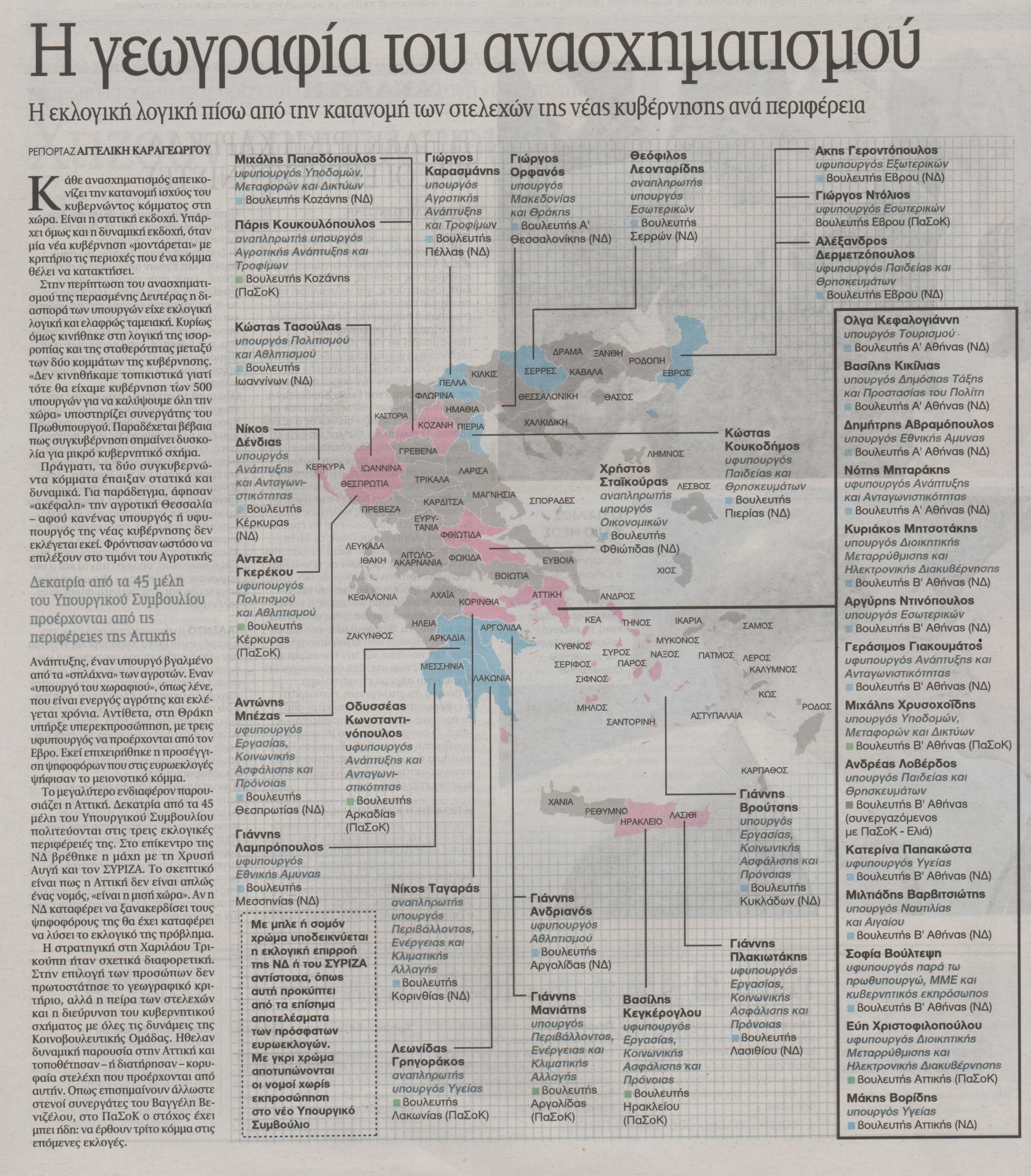 Κάθε ανασχηματισμός απεικονίζει την κατανομή ισχύος του κυβερνώντος κόμματος στη χώρα. Είναι η στατική εκδοχή. Υπάρχει όμως και η δυναμική εκδοχή, όταν μία νέα κυβέρνηση «μοντάρεται» με κριτήριο τις περιοχές που ένα κόμμα θέλει να κατακτήσει.