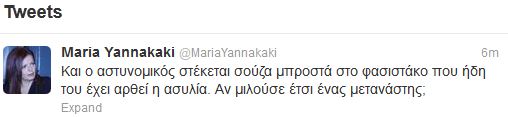 “Και ο αστυνομικός στέκεται σούζα μπροστά στο φασιστάκο που ήδη του έχει αρθεί η ασυλία. Αν μιλούσε έτσι ένας μετανάστης; “, ήταν το σχόλιο της κ. Γιαννακάκη.