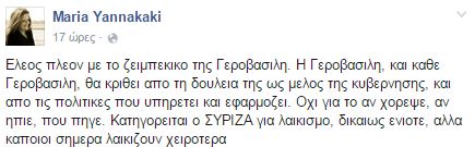 “Έλεος πλέον με το ζεϊμπέκικο της Γεροβασίλη. Η Γεροβασίλη, και κάθε Γεροβασίλη, θα κριθεί από τη δουλειά της ως μέλος της κυβέρνησης, και από τις πολιτικές που υπηρετεί και εφαρμόζει. Όχι για το αν χόρεψε, αν ήπιε, που πήγε. Κατηγορείται ο ΣΥΡΙΖΑ για λαϊκισμό, δικαίως ενίοτε, αλλά κάποιοι σήμερα λαϊκίζουν χειρότερα” έγραψε στο Facebook.