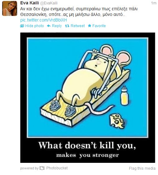 Αν και ακόμα δεν έχει ανακοινωθεί επισήμως ποια έδρα θα επιλέξει ο πρόεδρος του ΠΑΣΟΚ Ευάγγελος Βενιζέλος, το Ηράκλειο ή τη Θεσσαλονίκη, η Εύα Καιλή φαίνεται πως το έχει δεδομένο πως μένει εκτός βουλής και αποφάσισε να πετάξει το καρφί της μέσω Twitter.Σημειώνεται πως το ΠΑΣΟΚ κέρδισε μόνο μία έδρα στη Α’ Θεσσαλονίκης, οπότε παρότι η νεαρή πολιτικός βγήκε πρώτη σε σταυρούς μπορεί να μείνει εκτός.”Αν και δεν έχω ενημερωθεί, συμπεραίνω πως επέλεξε πάλι Θεσσαλονίκη, οπότε..ας μη μιλήσω άλλο, μόνο αυτό…”, έγραψε η Έυα Καιλή πριν από λίγο, αφήνοντας σαφή υπονοούμενα.Επισύναψε μάλιστα και μία φωτογραφία στην οποία διαβάζουμε τη φράση: “Ότι δε σε σκοτώνει σε κάνει πιο δυνατό”.