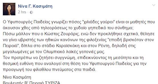 Με ανάρτησή της στον προσωπικό της λογαριασμό στο facebook η βουλευτής του ΣΥΡΙΖΑ, Νίνα Κασιμάτη, ζητά από τον υπουργό Παιδείας, Κώστα Ζουράρι, να ζητήσει συγγνώμη για το «ποδοσφαιρικό» σύνθημα που είπε σε τηλεοπτική του συνέντευξη, το οποίο προσέβαλλε τους οπαδούς του Ολυμπιακού.Διαβάστε τι έγραψε στον προσωπικό της λογαριασμό στο facebook:«Ο Υφυπουργός Παιδείας γνωρίζει πόσες “χιλιάδες γαύροι” είναι οι μαθητές που άκουσαν χθες από τηλεοράσεως το χυδαίο γηπεδικό του σύνθημα;Πόσω μάλλον που ο Κώστας Ζουράρις, ενώ δεν προκλήθηκε σχετικά, θέλησε να γίνει υβριστής των ηθικών κανόνων της φιλοξενίας “επειδή βρισκόταν στον Πειραιά”, δίπλα στο στάδιο Καραϊσκάκη και στον Ρέντη, δηλαδή στις μεγαλωμένες με τον Ολυμπιακό λαϊκές γειτονιές μας. Τον προτρέπω να ζητήσει συγγνώμη, επιδεικνύοντας τη μεσότητα και τη θεσμική ευθύνη που αναλογεί στη θέση του Υφυπουργού Παιδείας για την προαγωγή του φίλαθλου πνεύματος στα παιδιά.Νίνα ΚασιμάτηΒουλευτής Β’ Πειραιά ΣΥΡΙΖΑ»