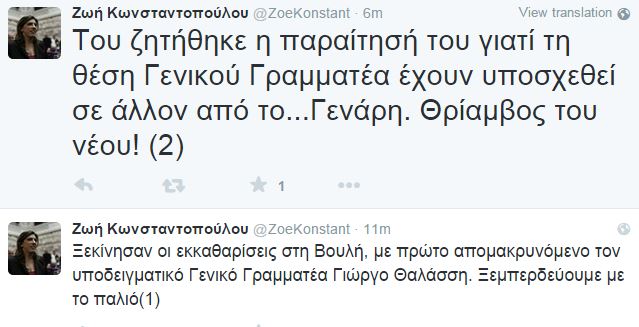 Του ζητήθηκε η παραίτησή του γιατί τη θέση Γενικού Γραμματέα έχουν υποσχεθεί σε άλλον από το…Γενάρη. Θρίαμβος του νέου!” έγραψε η Ζωή Κωνσταντοπούλου στο Twitter.
