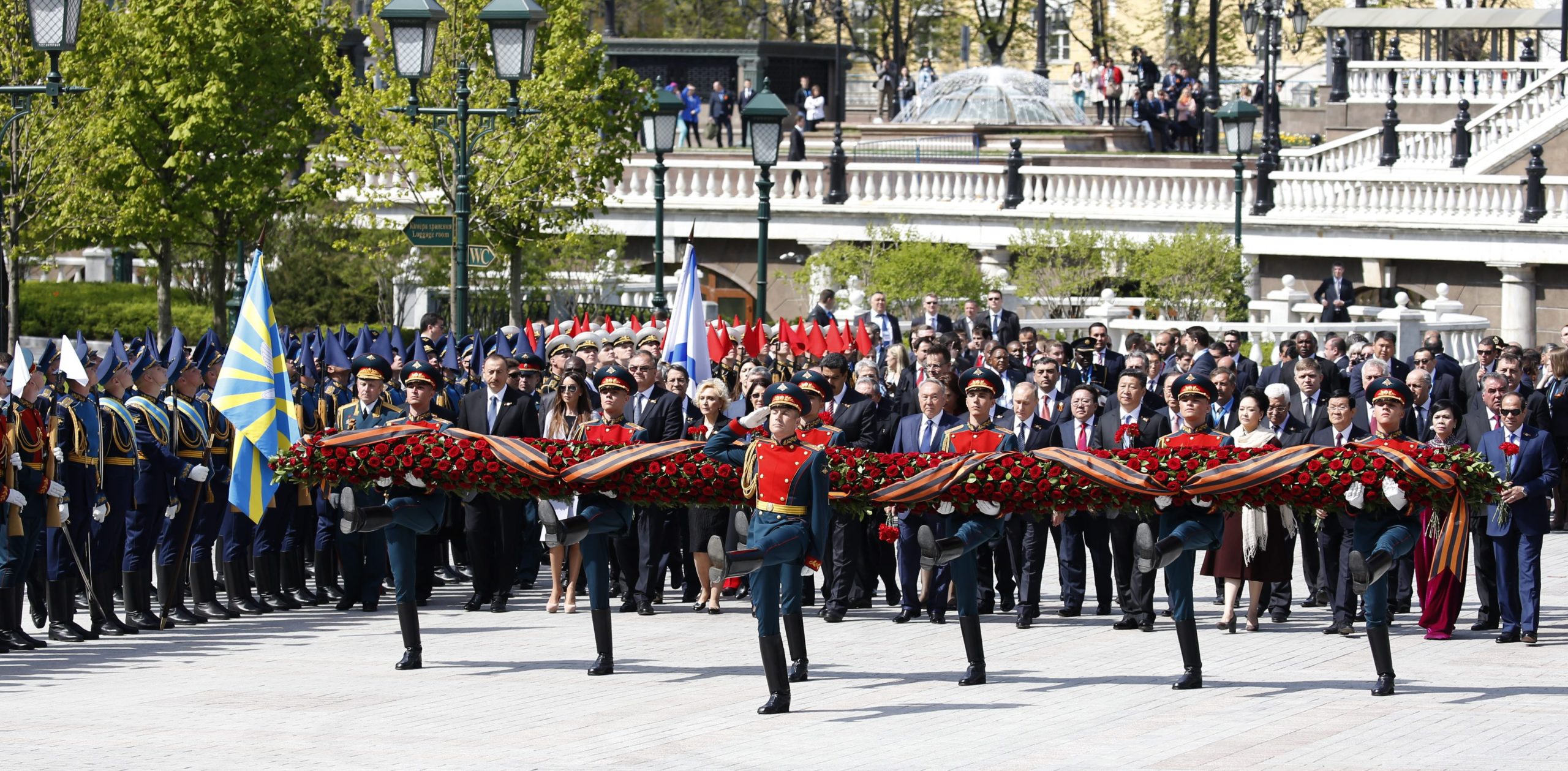 Ο Βλαντιμίρ Πούτιν και οι προσκεκλημένοι ξένοι ηγέτες κατέθεσαν ομαδικά στεφάνι στο Μνημείο του Αγνώστου Στρατιώτη και τώρα παρευρίσκονται στη δεξίωση που παραθέτει ο Ρώσος ηγέτης στο Κρεμλίνο. Ο Ρώσος ηγέτης υποδέχθηκε έναν έναν τους ξένους ηγέτες, ανάμεσα στους οποίους ο Γ.Γ. του ΟΗΕ Παν Γκι Μουν, οι ηγέτες της Τσεχίας Μίλος Ζέμαν, της Βενεζουέλας Νίκολας Μαδούρο, της Κούβας Ραούλ Κάστρο, Αζερμπαϊτζάν Ιλχάν Αλίεφ, Αρμενίας Σερζ Σαργκισιάν κλπ.
