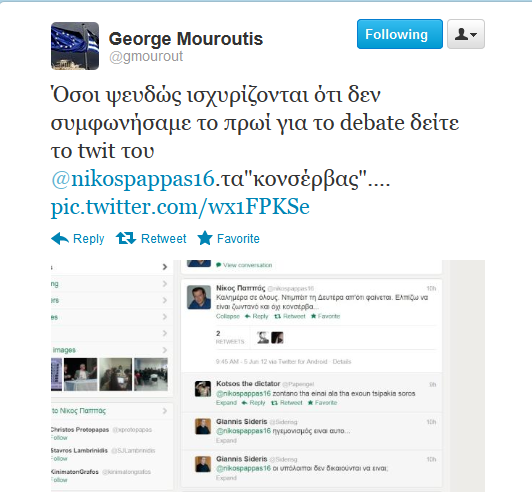 Η ΝΔ έχει κάθε δυνατότητα να εξηγήσει, δημοσίως πλέον και όχι με διαρροές, σε ποια σημεία συμφωνεί και με ποια διαφωνεί”. Ο Γ. Μουρούτης “δείχνει” και το Twitter Πριν από λίγο, ο αναπληρωτής εκπρόσωπος της ΝΔ έγραψε στο Twitter ότι όσοι ψευδώς ισχυρίζονται ότι δεν συμφωνήσαμε το πρωί για το debate να δουν το twit του Νίκου Παππά και επισυνάπτει φωτογραφία με το συγκεκριμένο twit.