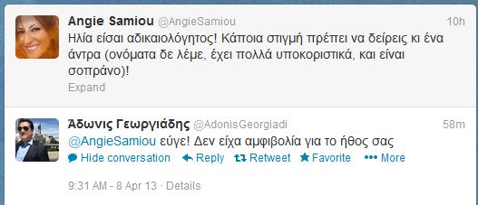 Κόντρα έχει ξεσπάσει ανάμεσα στη γνωστή τραγουδίστρια Άντζυ Σαμίου και τον βουλευτή της Νέας Δημοκρατίας, Άδωνι Γεωργιάδη. Η γνωστή τραγουδίστρια έγραψε στο twitter ένα κείμενο γεμάτο ερωτηματικά, με το οποίο ζητούσε από τον “Ηλία” να δείρει έναν άντρα… “σοπράνο”. Πολλοί χρήστες του twitter είδαν πίσω από το tweet της Σαμίου τον Άδωνι Γεωργιάδη, ο οποίος της απάντησε: “Εύγε! Δεν είχα αμφιβολία για το ήθος σας”.