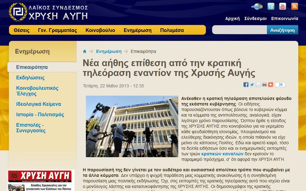 Ανέκαθεν η κρατική τηλεόραση αποτελούσε φέουδο της εκάστοτε κυβέρνησης. Οι ειδήσεις παρουσιαζόντουσαν όπως βόλευε το κυβερνών κόμμα και τα κόμματα της αντιπολίτευσης, αναλογικά, είχαν λιγότερο χρόνο παρουσίασης. Ώσπου ήρθε η είσοδος της ΧΡΥΣΗΣ ΑΥΓΗΣ στο κοινοβούλιο για να γκρεμίσει κάθε ψευδαίσθηση ισονομίας, πλουραλισμού και ελεύθερης διακίνησης ιδεών, η οποία πιθανόν να είχε μείνει σε κάποιους Πολίτες. Εδώ και αρκετό καιρό, τόσο τα δελτία ειδήσεων όσο και οι ενημερωτικές εκπομπές των τριών κρατικών καναλιών δεν κρατούν το παραμικρό πρόσχημα, σ’ ότι αφορά την ΧΡΥΣΗ ΑΥΓΗ.