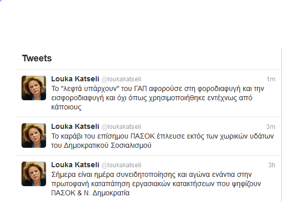 Με αφορμή την επέτειο της εργατικής Πρωτομαγιάς, η Λούκα Κατσέλη, γράφει στο twitter:”Σήμερα είναι ημέρα συνειδητοποίησης και αγώνα ενάντια στην πρωτοφανή καταπάτηση εργασιακών κατακτήσεων που ψηφίζουν ΠΑΣΟΚ και Ν.Δ.” ενώ αναφερόμενη στο ΠΑΣΟΚ γράφει:”Το καράβι του επίσημου ΠΑΣΟΚ έπλευσε εκτός των χωρικών υδάτων του Δημοκρατικού Σοσιαλισμού”.Στη συνέχεια σχολιάζοντας την περίφημη φράση του Γιώργου Παπανδρέου, “Λεφτά Υπάρχουν” σημειώνει, ότι αφορούσε στη φοροδιαφυγή και την εισφοροδιαφυγή “και όχι όπως χρησιμοποιήθηκε εντέχνως από κάποιους”.
