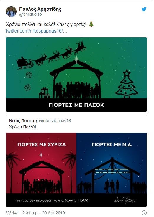 Κόντρα ξέσπασε στα social media ανάμεσα στον ΣΥΡΙΖΑ και το ΚΙΝΑΛ για τις… φάτνες.Συγκεκριμένα, ο βουλευτής του ΣΥΡΙΖΑ, Νίκος Παππάς ανήρτησε ευχετήρια κάρτα του κόμματός του με αιχμές για τη ΝΔ με τον βουλευτή του ΚΙΝΑΛ, Παύλο Χρηστίδη να του απαντά.Ο κ. Παππάς ανέβασε στο twitter δύο εικόνες με δύο φάτνες. Στην αριστερή φάτνη γράφει «Γιορτές με ΣΥΡΙΖΑ» με κόκκινο φόντο και οι άνθρωποι βρίσκονται μέσα σε αυτήν. Στη δεξιά φάτνη, γράφει «Γιορτές με ΝΔ» σε μπλε φόντο, και δείχνει μόνο τρεις ανθρώπους να είναι μέσα στη φάτνη, και ο φωτισμός μοιάζει με εκείνον στη Βασιλίσσης Σοφίας.Ο βουλευτής του ΣΥΡΙΖΑ ακόμη στο σχόλιό του αναφέρει πως: «για μας δεν περισσεύει κανείς».Στη συνέχεια, ο βουλευτής του Κινήματος Αλλαγής,Παύλος Χρηστίδης, απάντησε με δικό του tweet στην ανάρτηση του Νίκου Παππά, δημοσιεύοντας μια χριστουγεννιάτικη κάρτα που αναφέρεται στο ΠΑΣΟΚ. Συγκεκριμένα, ήταν μία σε πράσινο φόντο, όπου υπήρχε μία φάτνη, στην οποία υπάρχει υπάρχει πολύς κόσμος, ενώ έξω από τη φάτνη υπάρχει ένα χριστουγεννιάτικο δέντρο και ο Άγιος Βασίλης να μοιράζει δώρα με το έλκηθρό του.