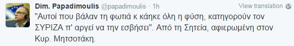 «Αυτοί που βάλαν τη φωτιά κ κάηκε όλη η φύση, κατηγορούν τον ΣΥΡΙΖΑ π’ αργεί να την εσβήσει”. Από τη Σητεία, αφιερωμένη στον Κυρ. Μητσοτάκη», έγραψε χαρακτηριστικά στον προσωπικό του λογαριασμό στο twitter.