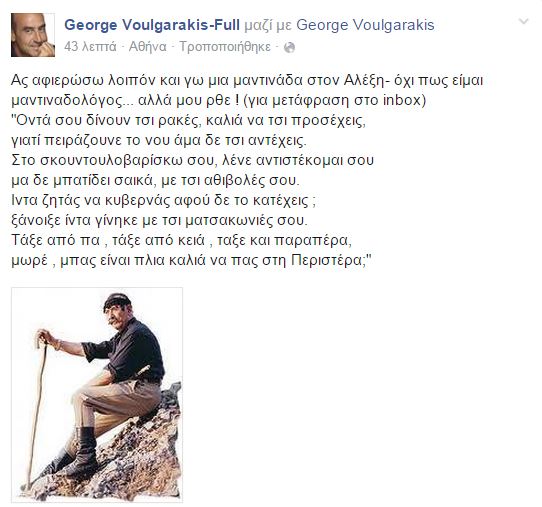 «Ας αφιερώσω λοιπόν και εγώ μια μαντινάδα στον Αλέξη- όχι πως είμαι μαντιναδολόγος… αλλά μου ήρθε.