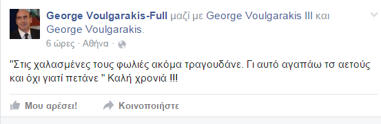 Με μία μαντινάδα που ανήρτησε στο facebook, υποδέχθηκε ο Γιώργος Βουλγαράκης το 2016. Συγκεκριμένα, έγραψε: “Στις χαλασμένες τους φωλιές ακόμα τραγουδάνε. Γι αυτό αγαπάω τσ αετούς και όχι γιατί πετάνε ” Καλή χρονιά!”.