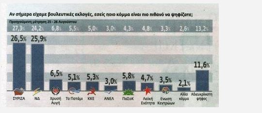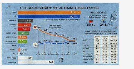 Συγκεκριμένα, στην πρόθεση ψήφου ο ΣΥΡΙΖΑ εμφανίζεται στο 26,5%, η ΝΔ στο 25,9%, η Χρυσή Αυγή στο 6,5%, το ΠΑΣΟΚ στο 5,8%, το ΚΚΕ στο 5,3%, το Ποτάμι στο 5,1%, η Λαϊκή Ενότητα στο 4,7%, η Ένωση Κεντρώων στο 3,5% και οι Ανεξάρτητοι Έλληνες στο 3% . Η αδιευκρίνιστη ψήφος βρίσκεται στο 11,6%.