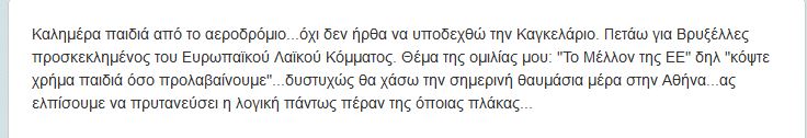 Πρωινές «καλημέρες» από τον Άδωνι Γεωργιάδη.Ο βουλευτής της ΝΔ μέσω του προσωπικού του λογαριασμού στο Twitter, ενημερώνει πως αναχωρεί για τις Βρυξέλλες στο πλαίσιο συμμετοχής του σε εκδήλωση του Ευρωπαϊκού Λαϊκού Κόμματος. Από τον κ. Γεωργιάδη δε λείπει και το χιούμορ αναφορικά με τη σημερινή ημέρα.Δείτε το σχόλιό του:«Καλημέρα παιδιά από το αεροδρόμιο…όχι δεν ήρθα να υποδεχθώ την Καγκελάριο. Πετάω για Βρυξέλλες προσκεκλημένος του Ευρωπαϊκού Λαϊκού Κόμματος. Θέμα της ομιλίας μου: “Το Μέλλον της ΕΕ” δηλ “κόψτε χρήμα παιδιά όσο προλαβαίνουμε”…δυστυχώς θα χάσω την σημερινή θαυμάσια μέρα στην Αθήνα…ας ελπίσουμε να πρυτανεύσει η λογική πάντως πέραν της όποιας πλάκας…».