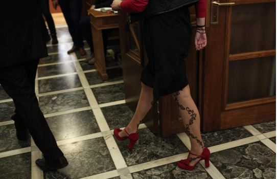 Η άγνωστη γυναίκα φορώντας ένα εντυπωσιακό καλσόν και κόκκινες γόβες τράβηξε όπως ήταν φυσικό τα βλέμματα όλων.