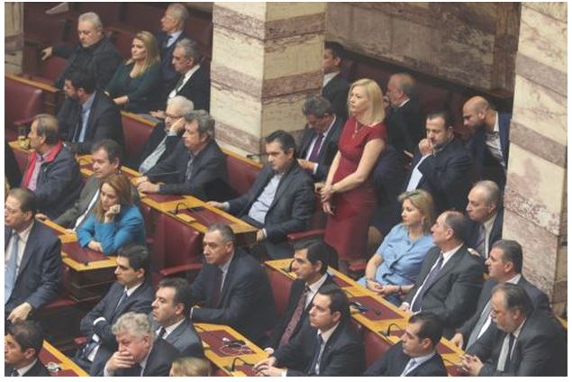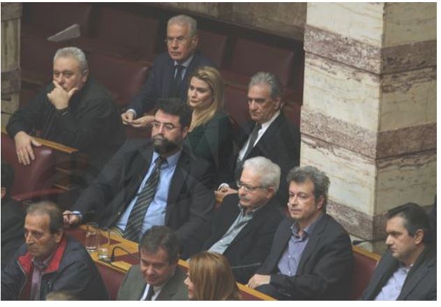 Στα έδρανα των Ανεξάρτητων Δημοκρατικών βουλευτών διακρίνονται οι Μίμης Ανδρουλάκης , Πέτρος Τατσόπουλος και ο ανεξάρτητος Βασίλης Οικονόμου.
