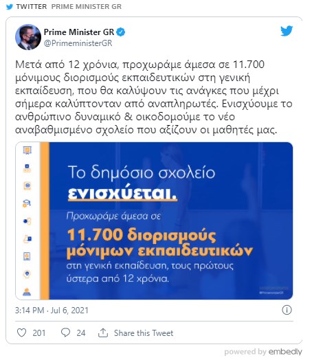 Επί του θέματος τοποθετήθηκε στο Twitter και ο Κυριάκος Μητσοτάκης. Στην ανάρτησή του στον πρωθυπουργικό λογαριασμό, ο κ. Μητσοτάκης ανέφερε: «Μετά από 12 χρόνια, προχωράμε άμεσα σε 11.700 μόνιμους διορισμούς εκπαιδευτικών στη γενική εκπαίδευση που θα καλύψουν τις ανάγκες που μέχρι σήμερα καλύπτονταν από αναπληρωτές. Ενισχύουμε το ανθρώπινο δυναμικό και οικοδομούμε το νέο αναβαθμισμένο σχολείο που αξίζουν οι μαθητές μας».